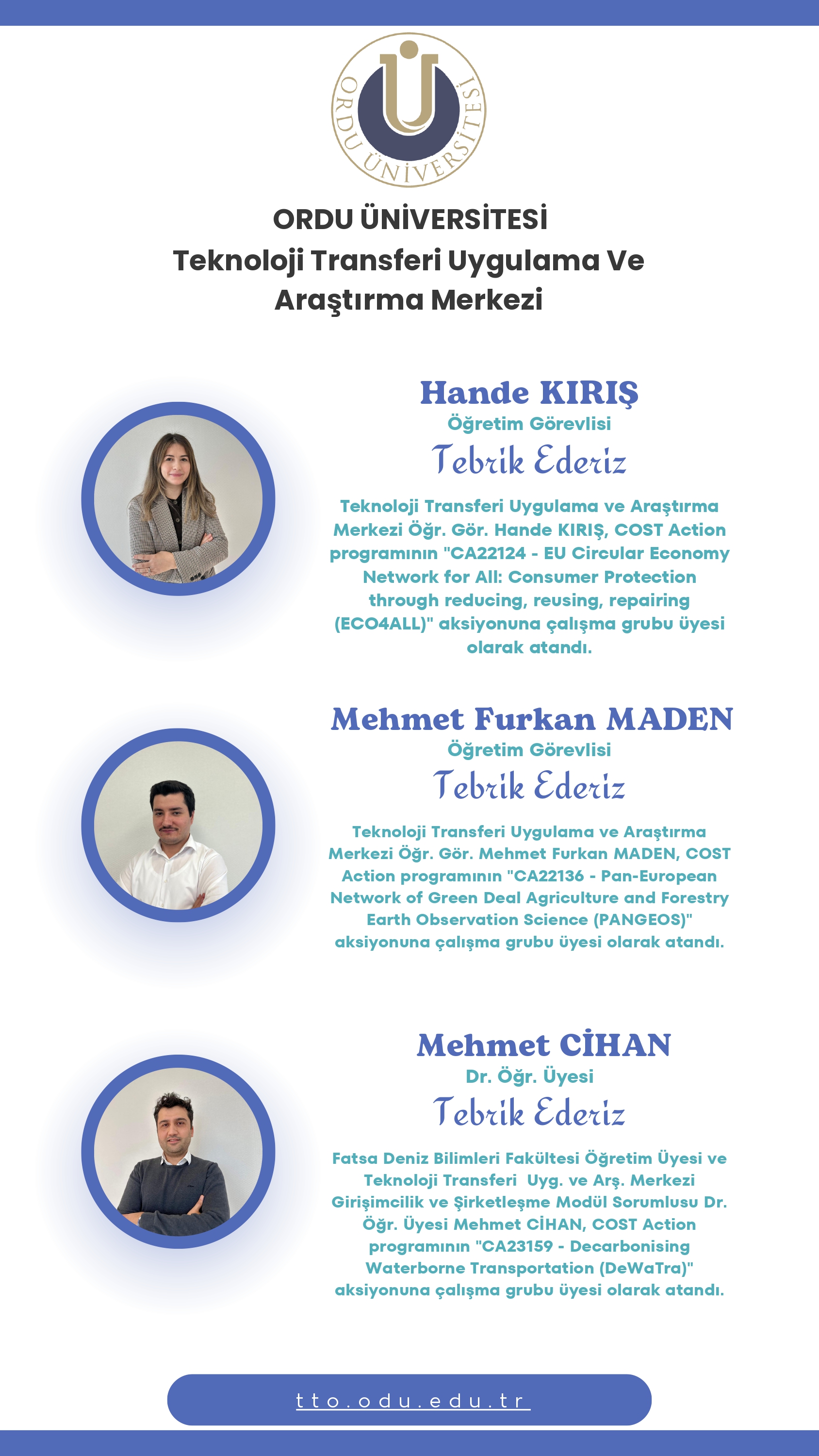 2025 yılı Ekim–Kasım döneminde COST Aksiyonlarına atanarak ülkemizi temsil etmeye hak kazanan araştırmacılarımızı tebrik eder, görev alacakları aksiyonlardaki çalışmalarında başarılar dileriz.